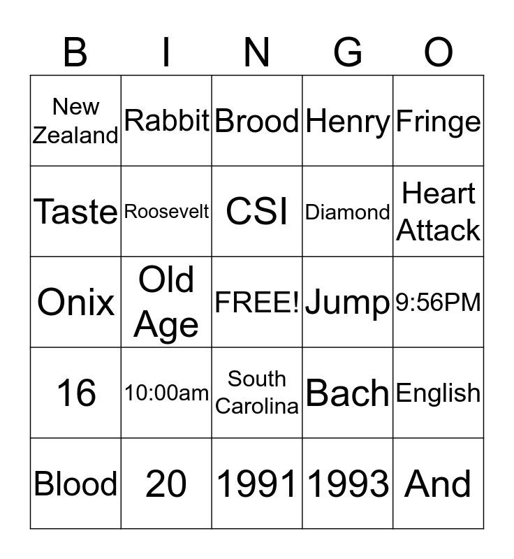 This bingo card has a free space and 24 words: 10:00am, 20, CSI, Blood, Fringe, New Zealand, Taste, Rabbit, Jump, South Carolina, Diamond, Onix, Bach, English, Roosevelt, 1993, 9:56PM, Brood, Heart Attack, Old Age, And, 16, Henry and 1991.