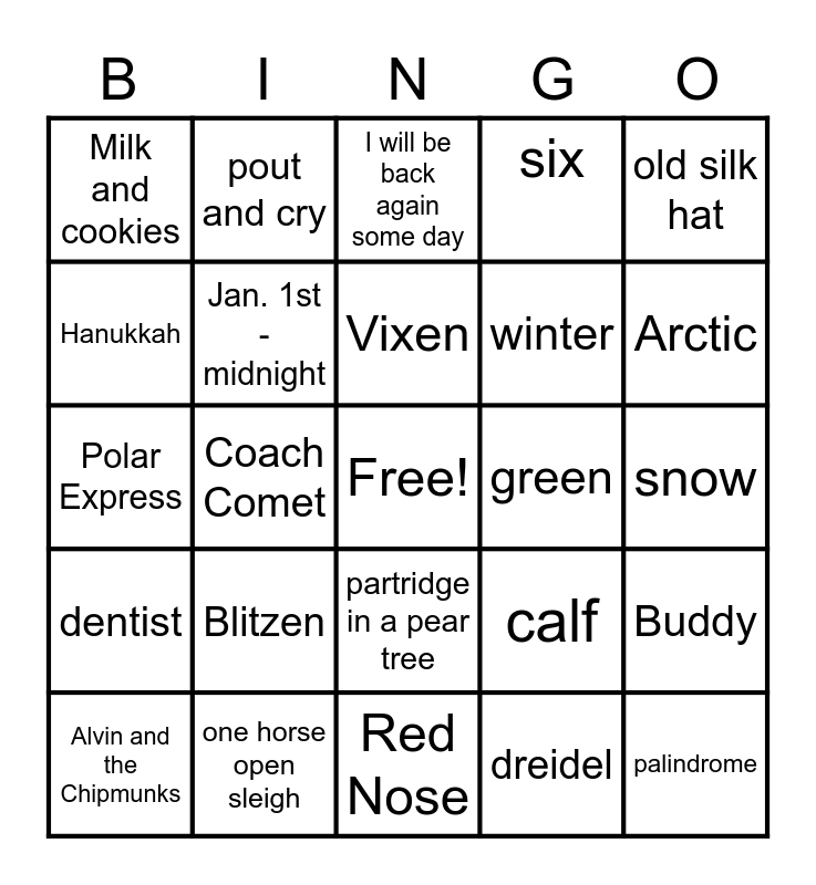 This bingo card has a free space and 24 words: Blitzen, one horse open sleigh, Vixen, Alvin and the Chipmunks, old silk hat, Milk and cookies, Hanukkah, pout and cry, green, partridge in a pear tree, winter, Polar Express, calf, Buddy, Jan. 1st - midnight, dreidel, snow, I will be back again some day, Arctic, Coach Comet, palindrome, dentist, six and Red Nose.