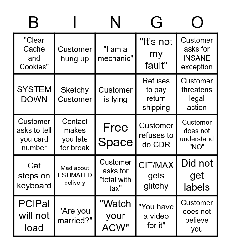 This bingo card has a free space and 56 words: Customer Cannot use PCIPal, PCIPal will not load, "iT sAiD gUaRaNtEeD tO fIt", "Clear Cache and Cookies", "Watch your ACW", ManSplaining, Sketchy Customer, Customer doing something gross, Refuses to pay return shipping, "I ordered the right parts", "It's not my fault", Customer calls you a pet name, Multiple customer on call, Crazy things in background, Customer asks you to hold, Escalation, Customer asks for INSANE exception, Contact makes you late for break, Customer refuses to give vehicle info, Customer does not believe you, Customer refuses to do CDR, Customer did NOT read listing, CIT/MAX gets glitchy, "I am a mechanic", Customer says they know what they are talking about but doesn't, Customer is lying, Customer accuses us of being liars or scammers or sketchy, Arguing about tow mirrors, Customer threatens legal action, Customer threatens you, Customer curses you out, "I need to speak to a man", Customer asks for tech/mechanic, Customer asks for more info on part we do not carry, Customer does not understand "NO", SYSTEM DOWN, Customer asks to tell you card number, "Can I text you a picture?", Cat steps on keyboard, Customer hung up, Customer asks for "total with tax", Customer asks for discount, "But I saw it online", Signify Cancel, Same Day Delivery, Mad about ESTIMATED delivery, "Are you married?", Customer hits on you, Customer mad about damaged packaging, Customer mentions YouTube videos, "You have a video for it", Tries to return order over a year old, "Is that both?", "Are bulbs included?", Did not get labels and Customer flushes and does not wash hands.