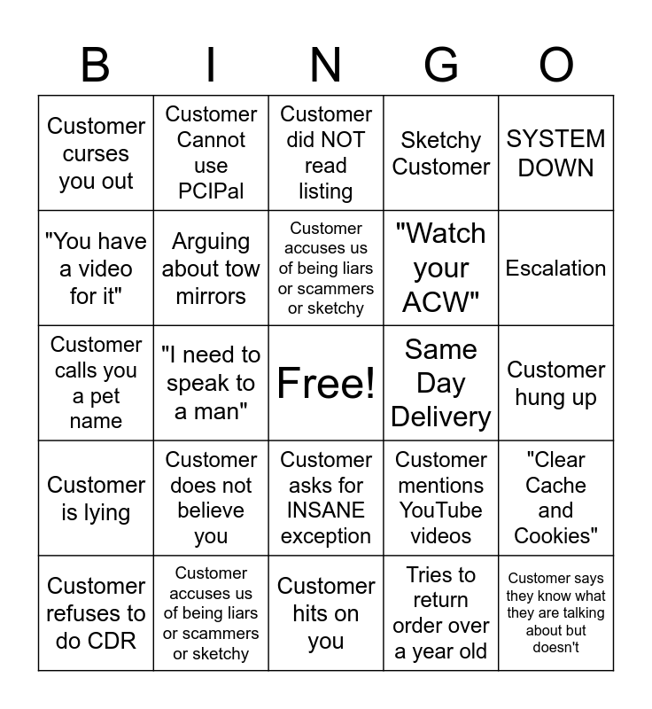 This bingo card has a free space and 112 words: Customer Cannot use PCIPal, PCIPal will not load, "iT sAiD gUaRaNtEeD tO fIt", "Clear Cache and Cookies", "Watch your ACW", ManSplaining, Sketchy Customer, Customer doing something gross, Refuses to pay return shipping, "I ordered the right parts", "It's not my fault", Customer calls you a pet name, Multiple customer on call, Crazy things in background, Customer asks you to hold, Escalation, Customer asks for INSANE exception, Contact makes you late for break, Customer refuses to give vehicle info, Customer does not believe you, Customer refuses to do CDR, Customer did NOT read listing, CIT/MAX gets glitchy, "I am a mechanic", Customer says they know what they are talking about but doesn't, Customer is lying, Customer accuses us of being liars or scammers or sketchy, Arguing about tow mirrors, Customer threatens legal action, Customer threatens you, Customer curses you out, "I need to speak to a man", Customer asks for tech/mechanic, Customer asks for more info on part we do not carry, Customer does not understand "NO", SYSTEM DOWN, Customer asks to tell you card number, "Can I text you a picture?", Cat steps on keyboard, Customer hung up, Customer asks for "total with tax", Customer asks for discount, "But I saw it online", Signify Cancel, Same Day Delivery, Mad about ESTIMATED delivery, "Are you married?", Customer hits on you, Customer mad about damaged packaging, Customer mentions YouTube videos, "You have a video for it", Tries to return order over a year old, "Is that both?", "Are bulbs included?", Did not get labels, Customer flushes and does not wash hands, Customer Cannot use PCIPal, PCIPal will not load, "iT sAiD gUaRaNtEeD tO fIt", "Clear Cache and Cookies", "Watch your ACW", ManSplaining, Sketchy Customer, Customer doing something gross, Refuses to pay return shipping, "I ordered the right parts", "It's not my fault", Customer calls you a pet name, Multiple customer on call, Crazy things in background, Customer asks you to hold, Escalation, Customer asks for INSANE exception, Contact makes you late for break, Customer refuses to give vehicle info, Customer does not believe you, Customer refuses to do CDR, Customer did NOT read listing, CIT/MAX gets glitchy, "I am a mechanic", Customer says they know what they are talking about but doesn't, Customer is lying, Customer accuses us of being liars or scammers or sketchy, Arguing about tow mirrors, Customer threatens legal action, Customer threatens you, Customer curses you out, "I need to speak to a man", Customer asks for tech/mechanic, Customer asks for more info on part we do not carry, Customer does not understand "NO", SYSTEM DOWN, Customer asks to tell you card number, "Can I text you a picture?", Cat steps on keyboard, Customer hung up, Customer asks for "total with tax", Customer asks for discount, "But I saw it online", Signify Cancel, Same Day Delivery, Mad about ESTIMATED delivery, "Are you married?", Customer hits on you, Customer mad about damaged packaging, Customer mentions YouTube videos, "You have a video for it", Tries to return order over a year old, "Is that both?", "Are bulbs included?", Did not get labels and Customer flushes and does not wash hands.