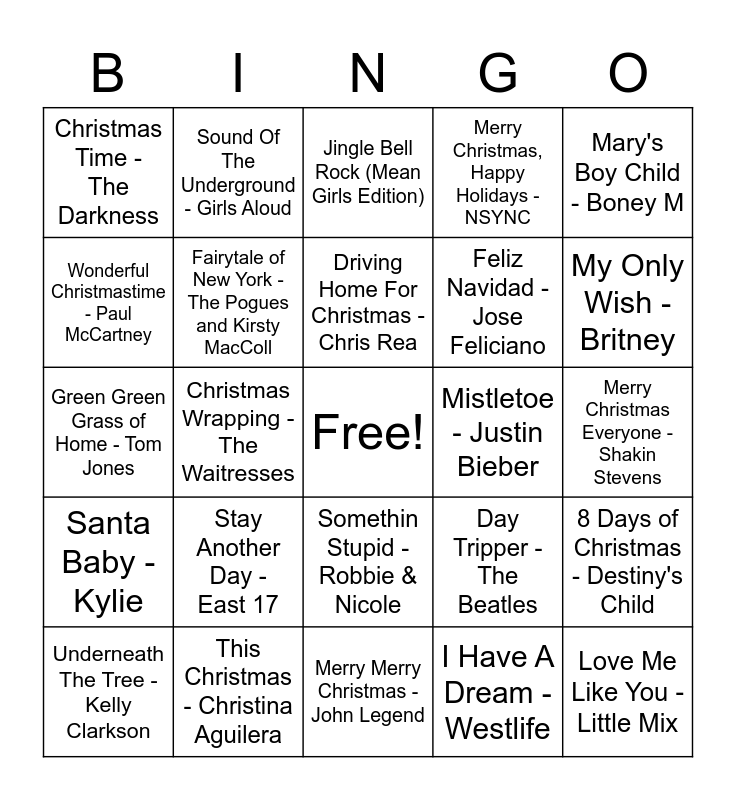 This bingo card has a free space and 38 words: Christmas (Baby Please Come Home) - Darlene Love, Last Christmas - Wham!, Merry Xmas Everybody - Slade, Fairytale of New York - The Pogues and Kirsty MacColl, 8 Days of Christmas - Destiny's Child, Stay Another Day - East 17, Driving Home For Christmas - Chris Rea, Stop The Cavalry - Jona Lewie, Mary's Boy Child - Boney M, Feliz Navidad - Jose Feliciano, Christmas Wrapping - The Waitresses, Merry Christmas, Happy Holidays - NSYNC, Love Me Like You - Little Mix, Merry Christmas Everyone - Shakin Stevens, Wonderful Christmastime - Paul McCartney, Santa Baby - Kylie, One More Sleep - Leona Lewis, Jingle Bell Rock (Mean Girls Edition), Little Saint Nick - The Beach Boys, Mistletoe - Justin Bieber, Christmas Time - The Darkness, This Christmas - Christina Aguilera, My Only Wish - Britney, Underneath The Tree - Kelly Clarkson, Santa Tell Me - Ariana Grande, Merry Merry Christmas - John Legend, Mistletoe and Wine - Cliff Richard, 2000 Miles - Pretenders, All I Want For Christmas Is You - Mariah, Do They Know It's Christmas - Band Aid, 2 Become 1 - Spice Girls, Somethin Stupid - Robbie & Nicole, I Have A Dream - Westlife, Sound Of The Underground - Girls Aloud, Don't You Want Me - The Human League, Day Tripper - The Beatles, Green Green Grass of Home - Tom Jones and Killing In The Name - Rage Against The Machine.