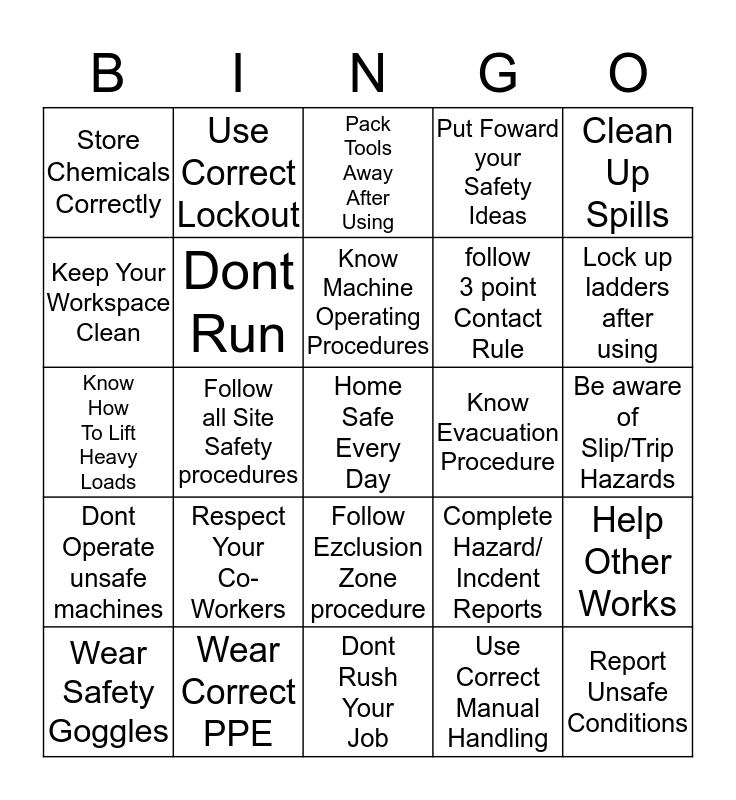 This bingo card has a free space and 24 words: Respect Your Co-Workers, Wear Correct PPE, Know Machine Operating Procedures, Wear Safety Goggles, Clean Up Spills, Store Chemicals Correctly, Keep Your Workspace Clean, Use Correct Lockout, Know Evacuation Procedure, Follow Ezclusion Zone procedure, follow 3 point Contact Rule, Know How To Lift Heavy Loads, Complete Hazard/ Incdent Reports, Help Other Works, Dont Run, Use Correct Manual Handling, Be aware of Slip/Trip Hazards, Pack Tools Away After Using, Lock up ladders after using, Follow all Site Safety procedures, Report Unsafe Conditions, Dont Operate unsafe machines, Put Foward your Safety Ideas and Dont Rush Your Job.