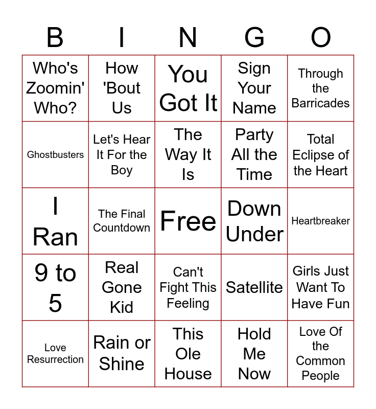 This bingo card has a free space and 34 words: Quiet Life, Hold Me Now, See The Day, Toy Boy, 9 to 5, Let's Hear It For the Boy, Through the Barricades, Love Resurrection, How 'Bout Us, Going Back To My Roots, The Way It Is, You Got It, Can You Feel It, Africa, Down Under, Total Eclipse of the Heart, Rain or Shine, I Ran, Real Gone Kid, Satellite, Can't Fight This Feeling, Don't Stop Believin', Who's Zoomin' Who?, Heartbreaker, This Ole House, Love Of the Common People, Sign Your Name, Walk Like An Egyptian, Party All the Time, Ghostbusters, Eye of the Tiger, The Final Countdown, Girls Just Want To Have Fun and Wake Me Up Before You Go-Go.