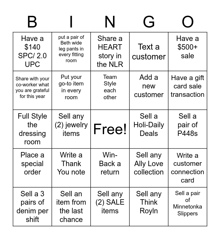 This bingo card has a free space and 24 words: Sell a 3 pairs of denim per shift, Write a Thank You note, Team Style each other, Sell any Think Royln, Have a $500+ sale, Have a $140 SPC/ 2.0 UPC, put a pair of Beth wide leg pants in every fitting room, Share a HEART story in the NLR, Sell a Holi-Daily Deals, Sell a pair of P448s, Full Style the dressing room, Put your go-to item in every room, Sell any Ally Love collection, Write a customer connection card, Share with your co-worker what you are grateful for this year, Sell an item from the last chance, Sell any (2) SALE items, Text a customer, Have a gift card sale transaction, Place a special order, Sell any (2) jewelry items, Win-Back a return, Add a new customer and Sell a pair of Minnetonka Slippers.