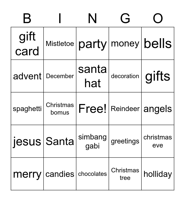 This bingo card has a free space and 24 words: Santa, candies, santa hat, merry, bells, gift card, advent, Mistletoe, Reindeer, simbang gabi, decoration, spaghetti, greetings, christmas eve, December, Christmas tree, angels, party, gifts, Christmas bomus, holliday, jesus, money and chocolates.
