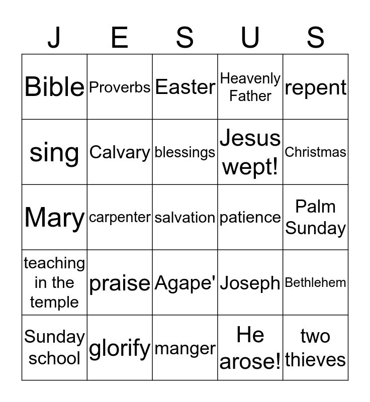 This bingo card has a free space and 24 words: praise, glorify, blessings, Sunday school, repent, Bible, sing, Proverbs, patience, Agape', Jesus wept!, Mary, Joseph, Bethlehem, Calvary, He arose!, Palm Sunday, Easter, Christmas, carpenter, two thieves, teaching in the temple, Heavenly Father and manger.