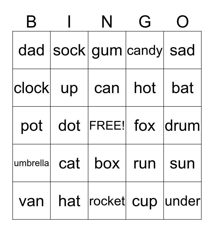 This bingo card has a free space and 24 words: cat, hat, can, van, sad, dad, clock, sock, fox, box, hot, pot, run, sun, up, cup, drum, gum, bat, dot, under, umbrella, candy and rocket.