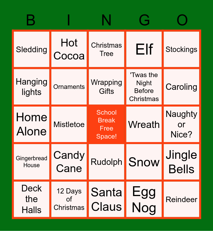 This bingo card has a free space and 24 words: Candy Cane, 12 Days of Christmas, Wrapping Gifts, Deck the Halls, Stockings, Sledding, Hanging lights, Hot Cocoa, Wreath, Rudolph, 'Twas the Night Before Christmas, Home Alone, Snow, Jingle Bells, Ornaments, Egg Nog, Naughty or Nice?, Christmas Tree, Caroling, Mistletoe, Reindeer, Gingerbread House, Elf and Santa Claus.