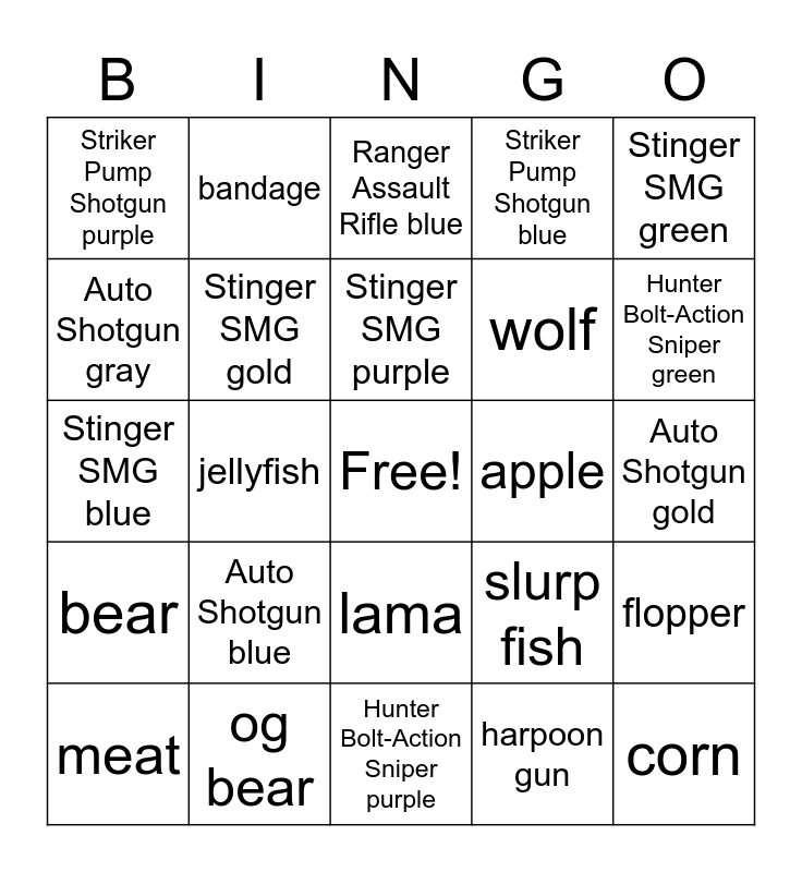 This bingo card has a free space and 78 words: Ranger Assault Rifle gray, Ranger Assault Rifle green, Ranger Assault Rifle blue, Ranger Assault Rifle purple, Ranger Assault Rifle gold, MK-Seven Assault Rifle gray, MK-Seven Assault Rifle green, MK-Seven Assault Rifle blue, MK-Seven Assault Rifle purple, MK-Seven Assault Rifle gold, Striker Pump Shotgun gray, Striker Pump Shotgun green, Striker Pump Shotgun blue, Striker Pump Shotgun purple, Striker Pump Shotgun gold, Auto Shotgun gray, Auto Shotgun green, Auto Shotgun blue, Auto Shotgun purple, Auto Shotgun gold, Stinger SMG gray, Stinger SMG green, Stinger SMG blue, Stinger SMG purple, Stinger SMG gold, Sidearm Pistol gray, Sidearm Pistol green, Sidearm Pistol blue, Sidearm Pistol purple, Sidearm Pistol gold, Hunter Bolt-Action Sniper green, Hunter Bolt-Action Sniper blue, Hunter Bolt-Action Sniper purple, Hunter Bolt-Action Sniper gold, meat, apple, banana, cabbage, coconut, corn, pepper, mushroom, slurp shroom, rift, fly jar, bandage, medkit, small shield potion, big pot, small fry, flopper, jellyfish, slurp fish, med mist, guzzle juice, tent, spiderman mithic, slurp barrel, legendary chest, lama, wolf, chicken, shark, hog, whiplash, vm whiplash, prevalent, gg2020 prevalent, bear, og bear, mudflap, titano mudflap, launch pad, armoured wall, harpoon gun, fishing rod, pro fishing rod and big tires.