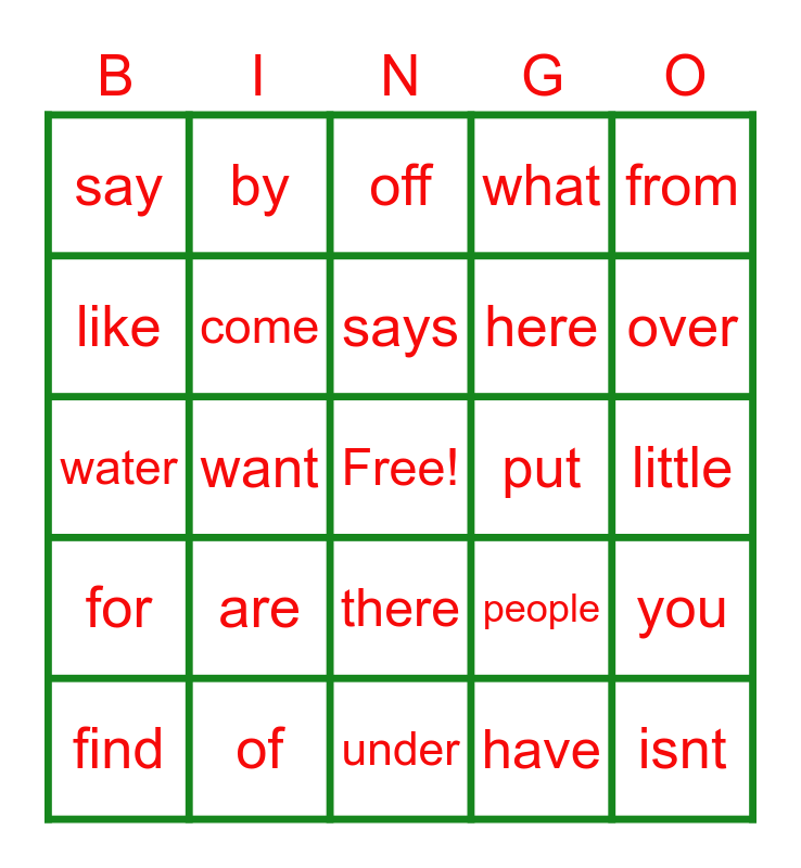 This bingo card has a free space and 35 words: Where, They, some, come, there, what, like, out, says, said, water, from, down, wasnt, say, put, have, want, for, isnt, people, find, you, of, off, over, that, she, here, little, put, under, are, by and get.
