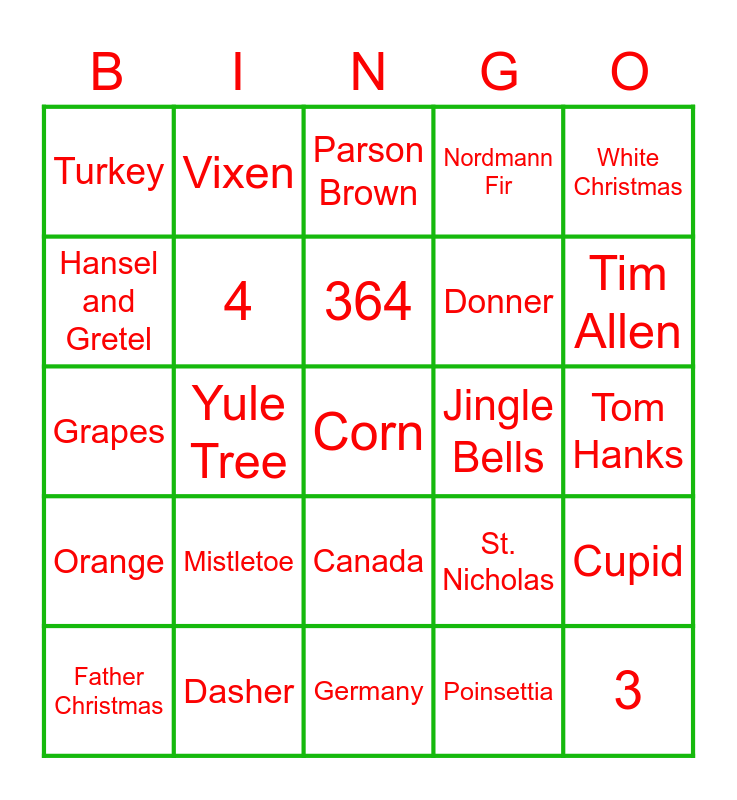 This bingo card has 25 words: Mistletoe, Germany, 364, Father Christmas, White Christmas, Turkey, Hansel and Gretel, Vixen, Jingle Bells, Canada, Donner, Grapes, St. Nicholas, Cupid, 4, 3, Tom Hanks, Parson Brown, Tim Allen, Yule Tree, Corn, Dasher, Orange, Nordmann Fir and Poinsettia.