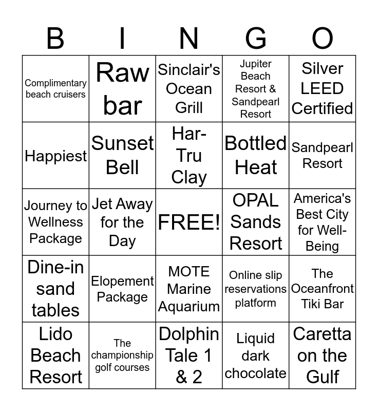 This bingo card has a free space and 24 words: Elopement Package, The championship golf courses, Har-Tru Clay, Lido Beach Resort, Silver LEED Certified, Complimentary beach cruisers, Happiest, Raw bar, OPAL Sands Resort, MOTE Marine Aquarium, Bottled Heat, Journey to Wellness Package, Online slip reservations platform, The Oceanfront Tiki Bar, Sunset Bell, Liquid dark chocolate, America's Best City for Well-Being, Sinclair's Ocean Grill, Sandpearl Resort, Jet Away for the Day, Caretta on the Gulf, Dine-in sand tables, Jupiter Beach Resort & Sandpearl Resort and Dolphin Tale 1 & 2.