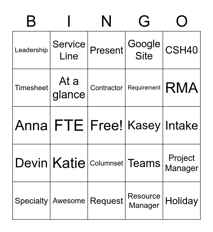 This bingo card has a free space and 41 words: Allocation, Anna, Approval, At a glance, Awesome, Columnset, Contractor, CSH39, CSH40, Devin, FTE, Google Site, Holiday, Intake, Kasey, Katie, Kelly, Leadership, PMO, Present, Project Manager, PTO, Request, Requirement, RES25, Reserve, Resource Manager, Resource Portfolio, RMA, Role, Schedule, Service Line, Specialty, Standard Activity, Teams, Timesheet, Trevor, Utilization, Vacation, Work Portfolio and Zach.