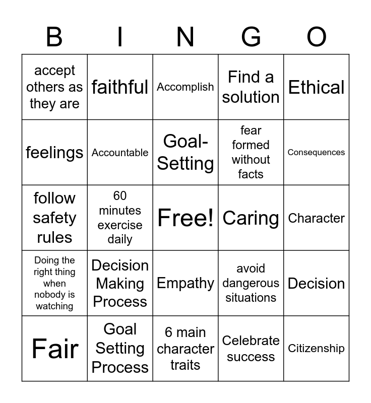 This bingo card has a free space and 31 words: 6 main character traits, 6 steps, 60 minutes exercise daily, abstain, accept others as they are, Accomplish, Accountable, avoid dangerous situations, Caring, Celebrate success, Character, Citizenship, Community, community service, Consequences, Cummulative Risk, Decision, Decision Making Process, Doing the right thing when nobody is watching, Empathy, Ethical, evaulate progress, Fair, faithful, fear formed without facts, feelings, Find a solution, follow safety rules, Goal Setting Process, Goal-Setting and good listener.