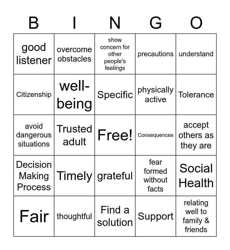 This bingo card has a free space and 87 words: 6 main character traits, 6 main character traits, grateful, sleep at least 8 hours, 6 steps, health triangle, Small Steps, 60 minutes exercise daily, Healthful, SMART GOALS, abstain, HELP formula, Social Health, accept others as they are, Honesty, Specific, Accomplish, Identify a specific goal, spirit of giving, Accountable, improve surroundings, State the situation, avoid dangerous situations, Integrity, Support, Caring, lifestyle factors, sympathy, Celebrate success, List the Options, thoughtful, Character, Long-term, Timely, Citizenship, loyal, Tolerance, Community, Mental Health, Trusted adult, community service, Obstacles, Trustworthy, Consequences, Outcomes, understand, Cummulative Risk, overcome obstacles, Values, Decision, Parent Approval, way a person thinks feels & acts, Decision Making Process, Physical Health, Weigh Options, Doing the right thing when nobody is watching, physically active, well balanced meals, Empathy, precautions, well-being, Ethical, Prejudice, Wellness, evaluate progress, prevention, willingness to answer for your actions, Fair, relating well to family & friends, good sport, faithful, Reliable, show concern for other people's feelings, fear formed without facts, Respect, feelings, Responsible, Find a solution, Reward, follow safety rules, Risk behaviors, Goal Setting Process, Safety, Goal-Setting, sedentary lifestyle, good listener and Short-term.