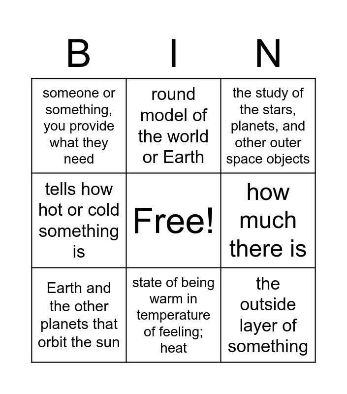 This bingo card has a free space and 8 words: how much there is, the study of the stars, planets, and other outer space objects, round model of the world or Earth, Earth and the other planets that orbit the sun, someone or something, you provide what they need, the outside layer of something, tells how hot or cold something is and state of being warm in temperature of feeling; heat.