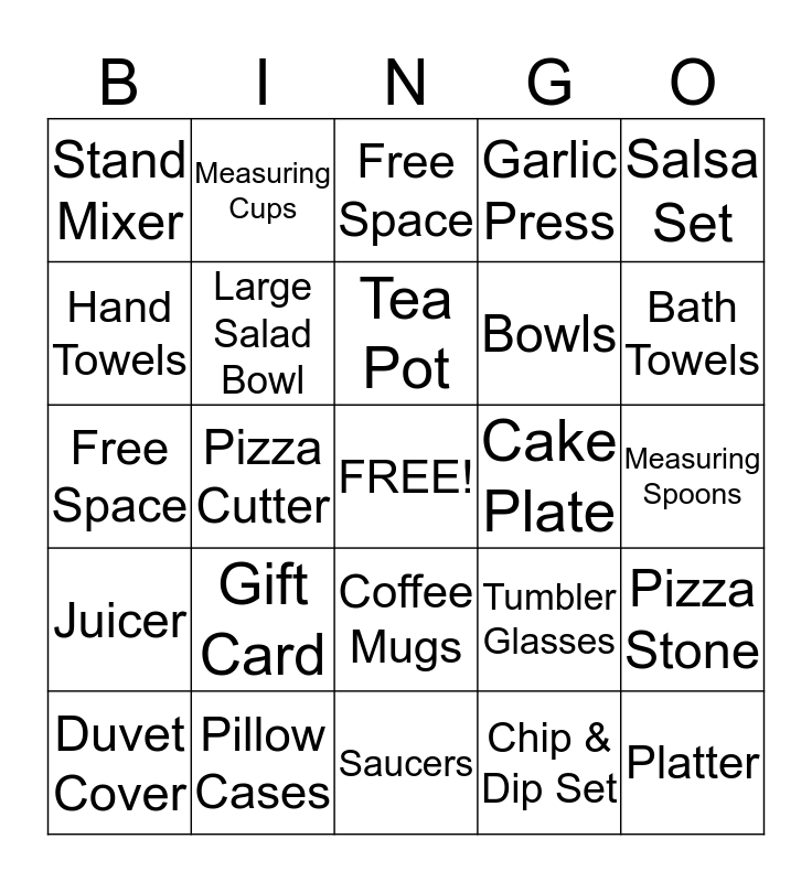 This bingo card has a free space and 42 words: Dinner Plates, Tea Pot, Sheets, Gift Card, Chip & Dip Set, Pizza Stone, Platter, Rolling Pin, Free Space, Coffee Mugs, Measuring Spoons, Bath Towels, Pizza Cutter, Salsa Set, Pots & Pans, Tumbler Glasses, Wooden Spoon, Free Space, Cutlery, Measuring Cups, Hand Towels, Can Opener, Tea Cups, Stand Mixer, Whiskey Stones, Cheese Grater, Bowls, Iron, Face Cloth, Pizza Pan, Ice Cream Scoop, Juicer, Large Salad Bowl, Saucers, Drinking Glasses, Duvet Cover, Pillow Cases, Cake Plate, Knife Set, Pillow Shams, Garlic Press and Cookie Sheet.