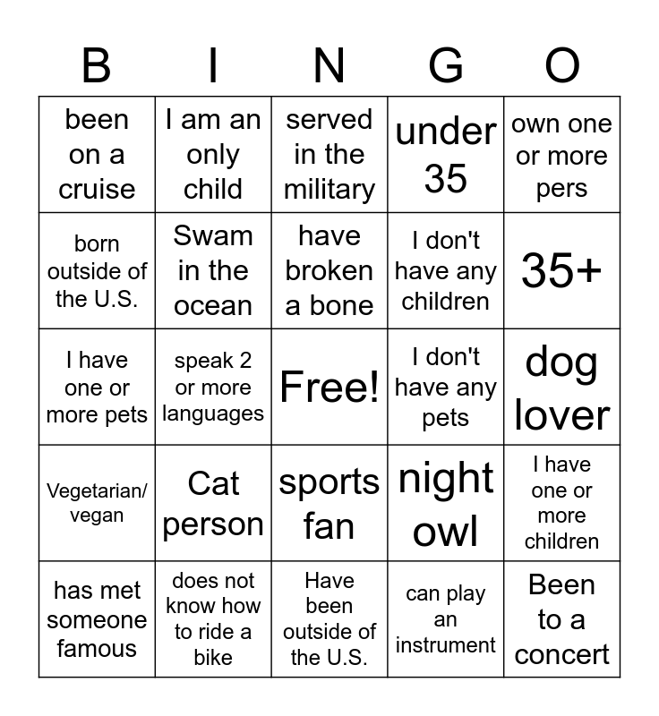 This bingo card has a free space and 24 words: Cat person, does not know how to ride a bike, have broken a bone, has met someone famous, own one or more pers, been on a cruise, born outside of the U.S., I am an only child, I don't have any pets, sports fan, I don't have any children, I have one or more pets, night owl, I have one or more children, Swam in the ocean, can play an instrument, dog lover, served in the military, 35+, speak 2 or more languages, Been to a concert, Vegetarian/ vegan, under 35 and Have been outside of the U.S..