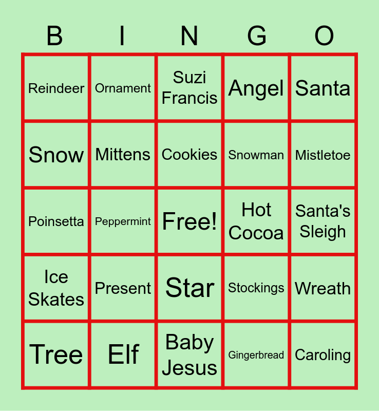 This bingo card has a free space and 24 words: Present, Elf, Cookies, Tree, Santa, Reindeer, Snow, Ornament, Hot Cocoa, Star, Snowman, Poinsetta, Stockings, Wreath, Mittens, Gingerbread, Santa's Sleigh, Suzi Francis, Mistletoe, Peppermint, Caroling, Ice Skates, Angel and Baby Jesus.