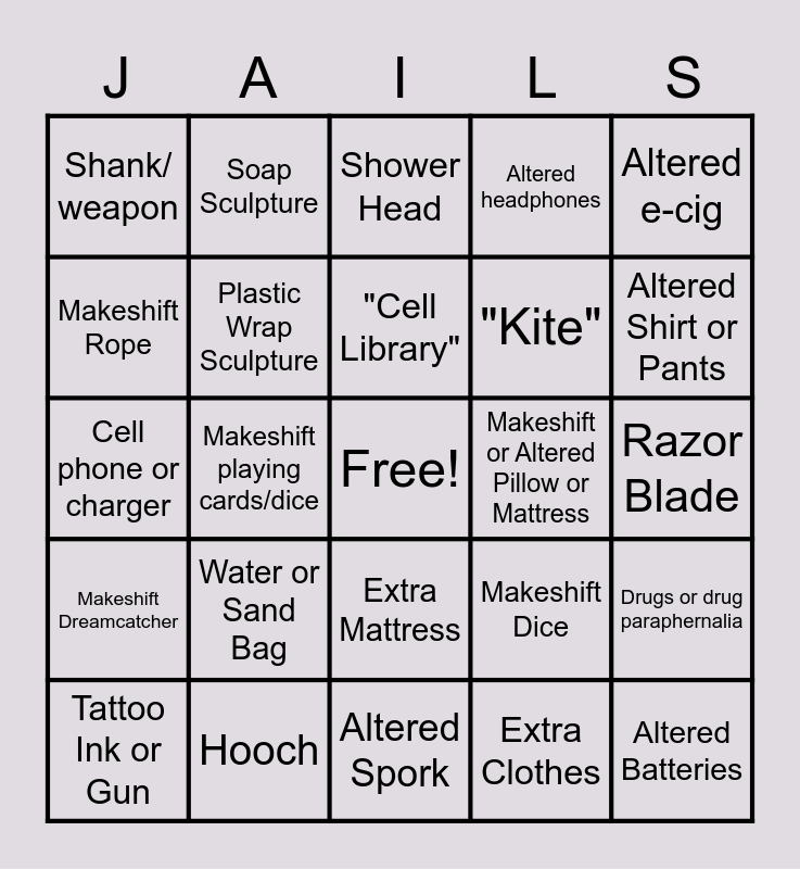 This bingo card has a free space and 26 words: Extra Mattress, Extra Clothes, "Cell Library", Hooch, Altered e-cig, Shank/ weapon, Makeshift Rope, Soap Sculpture, Razor Blade, Makeshift Dice, "Kite", Cell phone or charger, Drugs or drug paraphernalia, Tattoo Ink or Gun, Makeshift playing cards/dice, Unauthorized Tobacco (or other smoking items), Altered headphones, Makeshift Dreamcatcher, Shower Head, Altered Batteries, Altered Shirt or Pants, Altered Spork, Makeshift or Altered Pillow or Mattress, Water or Sand Bag, Plastic Wrap Sculpture and Altered Shoes.
