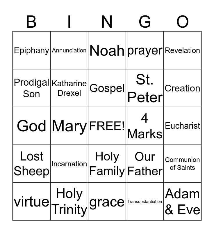This bingo card has a free space and 24 words: Incarnation, Holy Trinity, Gospel, virtue, Revelation, Epiphany, Prodigal Son, Annunciation, 4 Marks, Holy Family, St. Peter, God, Our Father, Communion of Saints, Katharine Drexel, Transubstantiation, Eucharist, Noah, Creation, Mary, Adam & Eve, Lost Sheep, prayer and grace.