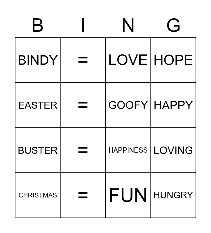 This bingo card has 16 words: CHRISTMAS, =, LOVE, HOPE, EASTER, =, HAPPINESS, LOVING, BINDY, =, FUN, HAPPY, BUSTER, =, GOOFY and HUNGRY.