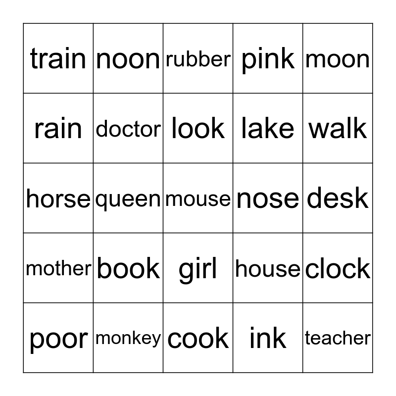 This bingo card has 25 words: book, cook, look, poor, moon, train, rain, noon, nose, girl, lake, horse, house, clock, doctor, teacher, desk, rubber, walk, queen, mouse, monkey, mother, pink and ink.