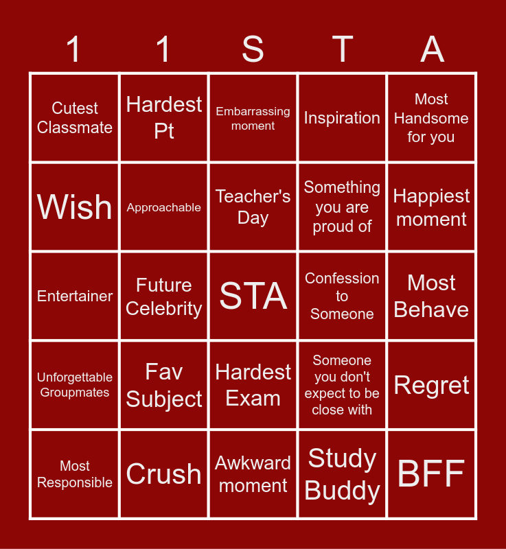 This bingo card has a free space and 29 words: Gen Math, Crush, Embarrassing moment, Prettiest for you, Most Handsome for you, Cutest Classmate, Approachable, Teacher's Day, Confession to Someone, Regret, Most Responsible, Future Celebrity, Study Buddy, BFF, Entertainer, Lutang Moment, Awkward moment, Someone you don't expect to be close with, Happiest moment, Unforgettable Groupmates, Fav Subject, Inspiration, Something you are proud of, Most Behave, Wish, Hardest Pt, Hardest Exam, Inspiration and Favorite line from a teacher.