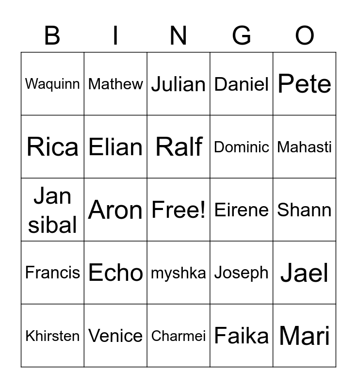 This bingo card has a free space and 24 words: Echo, Venice, Ralf, Khirsten, Pete, Waquinn, Rica, Mathew, Eirene, myshka, Dominic, Jan sibal, Joseph, Jael, Elian, Faika, Shann, Julian, Mahasti, Aron, Mari, Francis, Daniel and Charmei.