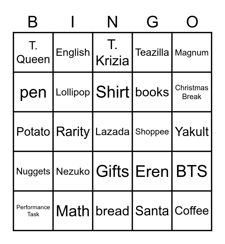 This bingo card has a free space and 34 words: T. Fatima, Santa, Stick - O, Chuckie, Nuggets, Lollipop, Magnum, Performance Task, English, T. April, Shirt, T. Krizia, Pajama, ice cream, Shoppee, Christmas Break, Math, Potato, Nezuko, Eren, Gifts, Chocolate, T. Queen, Yakult, bread, Coffee, Teazilla, brunch, books, pen, bunny, Rarity, BTS and Black Pink.