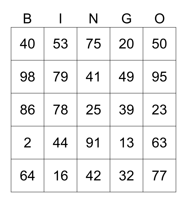 This bingo card has 25 words: 2, 16, 25, 32, 50, 40, 53, 75, 39, 63, 98, 79, 42, 13, 95, 64, 78, 41, 49, 23, 86, 44, 91, 20 and 77.
