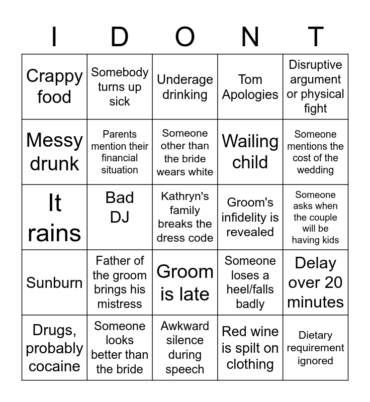 This bingo card has a free space and 24 words: Father of the groom brings his mistress, Someone looks better than the bride, Someone other than the bride wears white, Drugs, probably cocaine, Disruptive argument or physical fight, Crappy food, Messy drunk, Somebody turns up sick, Groom's infidelity is revealed, Groom is late, Wailing child, It rains, Someone loses a heel/falls badly, Delay over 20 minutes, Parents mention their financial situation, Red wine is spilt on clothing, Someone asks when the couple will be having kids, Underage drinking, Someone mentions the cost of the wedding, Bad DJ, Dietary requirement ignored, Sunburn, Tom Apologies and Awkward silence during speech.