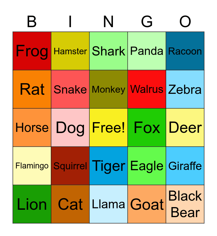 This bingo card has a free space and 24 words: Squirrel, Cat, Monkey, Lion, Racoon, Frog, Rat, Hamster, Fox, Tiger, Walrus, Horse, Eagle, Giraffe, Snake, Goat, Deer, Shark, Zebra, Dog, Black Bear, Flamingo, Panda and Llama.
