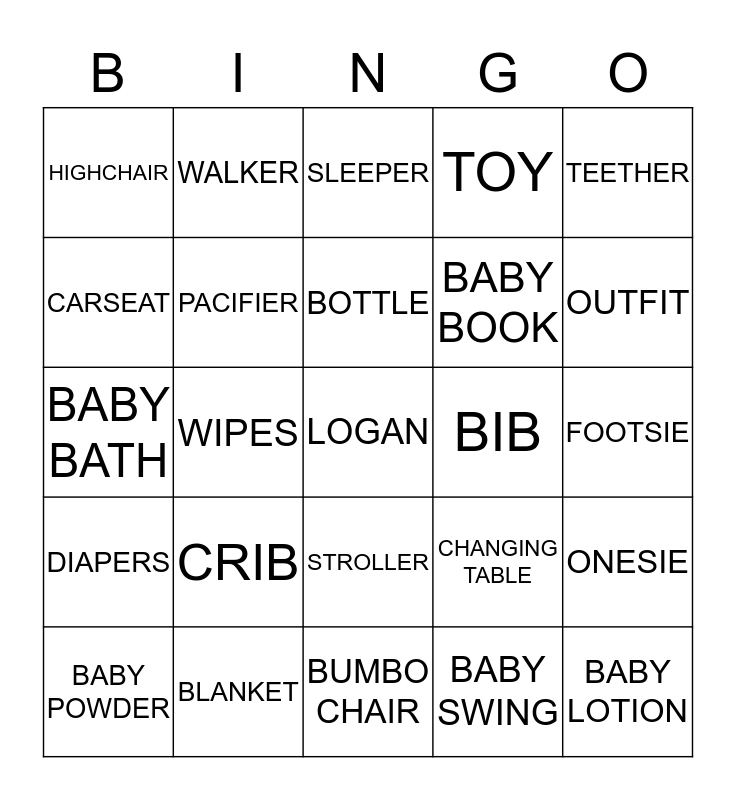 This bingo card has a free space and 24 words: CRIB, BLANKET, BOTTLE, BABY POWDER, TEETHER, HIGHCHAIR, CARSEAT, WALKER, BIB, STROLLER, BABY BOOK, BABY BATH, CHANGING TABLE, ONESIE, PACIFIER, BABY SWING, FOOTSIE, SLEEPER, OUTFIT, WIPES, BABY LOTION, DIAPERS, TOY and BUMBO CHAIR.