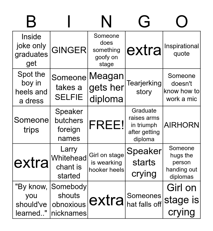 This bingo card has a free space and 24 words: Larry Whitehead chant is started, Somebody shouts obnoxious nicknames, Meagan gets her diploma, "By know, you should've learned..", Inspirational quote, Inside joke only graduates get, Spot the boy in heels and a dress, GINGER, Graduate raises arms in triumph after getting diploma, Girl on stage is wearking hooker heels, Tearjerking story, Someone trips, Speaker starts crying, Someone hugs the person handing out diplomas, Someone takes a SELFIE, Someones hat falls off, AIRHORN, Someone does something goofy on stage, Someone doesn't know how to work a mic, Speaker butchers foreign names, Girl on stage is crying, extra, extra and extra.