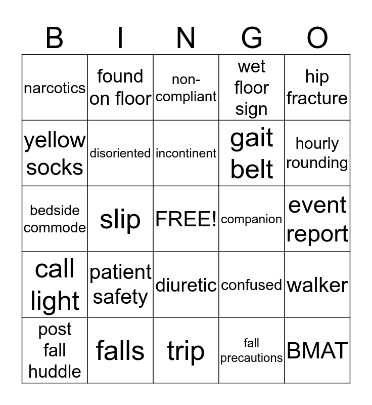 This bingo card has a free space and 24 words: patient safety, falls, incontinent, post fall huddle, hip fracture, narcotics, yellow socks, found on floor, companion, diuretic, gait belt, bedside commode, confused, walker, disoriented, fall precautions, event report, non-compliant, hourly rounding, slip, BMAT, call light, wet floor sign and trip.