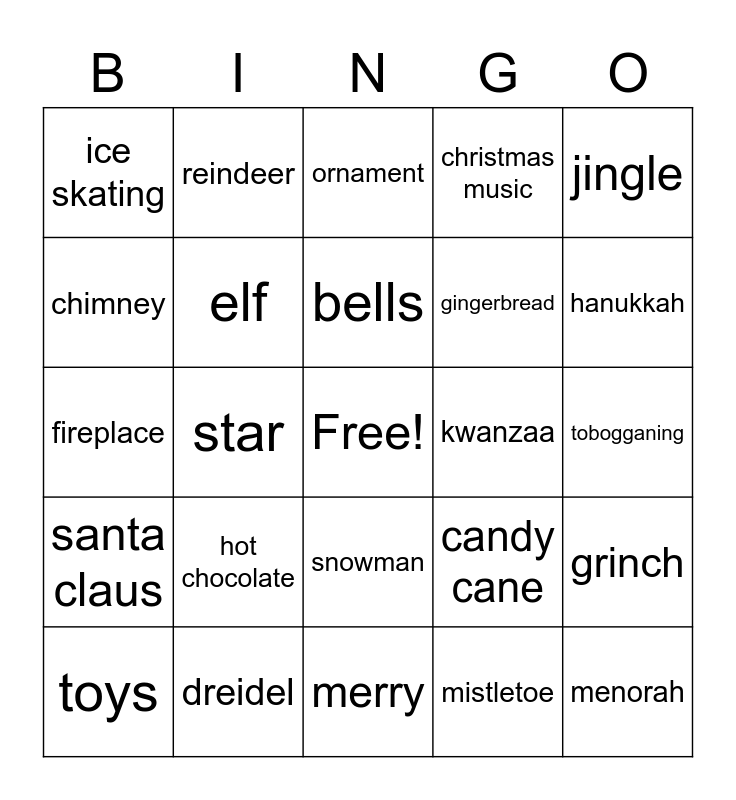 This bingo card has a free space and 34 words: stockings, mistletoe, carolling, winter, santa claus, elf, jingle, toys, reindeer, presents, bells, ornament, christmas, diwali, kwanzaa, hanukkah, dreidel, fireplace, hot chocolate, candy cane, snowman, wreath, ice skating, tobogganing, merry, menorah, christmas music, lights, gingerbread, chimney, sleigh, star, grinch and wishlist.