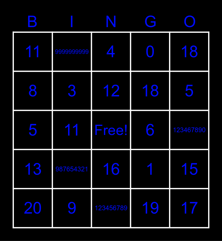 This bingo card has a free space and 35 words: 1, 10, 14, 3, 16, 0, 8, 0, 12, 4, 5, 18, 2, 7, 11, 6, 19, 11, 13, 17, 1, 20, 15, 9, 4, 5, 20, 9, 18, 123467890, 0987654321, 123456789, 987654321, 9999999999 and 0000000000.