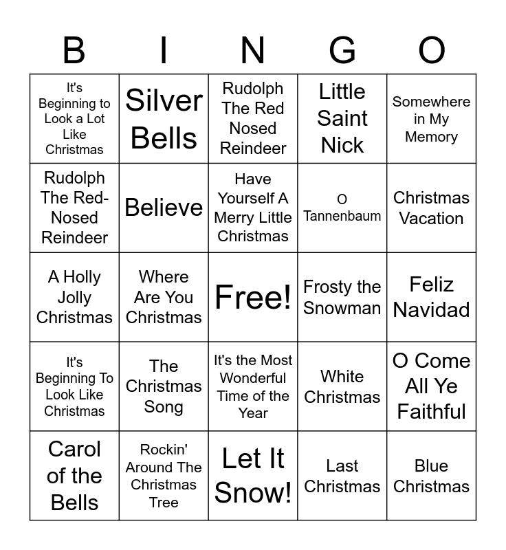This bingo card has a free space and 33 words: Baby, It’s Cold Outside, Kidnap The Sandy Claws, Where Are You Christmas, You're A Mean One, Mr. Grinch, It's Beginning To Look Like Christmas, Believe, Somewhere in My Memory, Carol of the Bells, Silver Bells, Good King Wenceslas, Have Yourself A Merry Little Christmas, Rudolph The Red Nosed Reindeer, Sleigh Ride, Mele Kalikimaka, Frosty the Snowman, Christmas Vacation, Rockin' Around The Christmas Tree, A Holly Jolly Christmas, The Christmas Song, White Christmas, It's the Most Wonderful Time of the Year, Jingle Bell Rock, It's Beginning to Look a Lot Like Christmas, Feliz Navidad, Let It Snow!, Blue Christmas, Little Saint Nick, O Tannenbaum, Rudolph The Red-Nosed Reindeer, O Come All Ye Faithful, Here Comes Santa Claus, Last Christmas and Deck the Halls.
