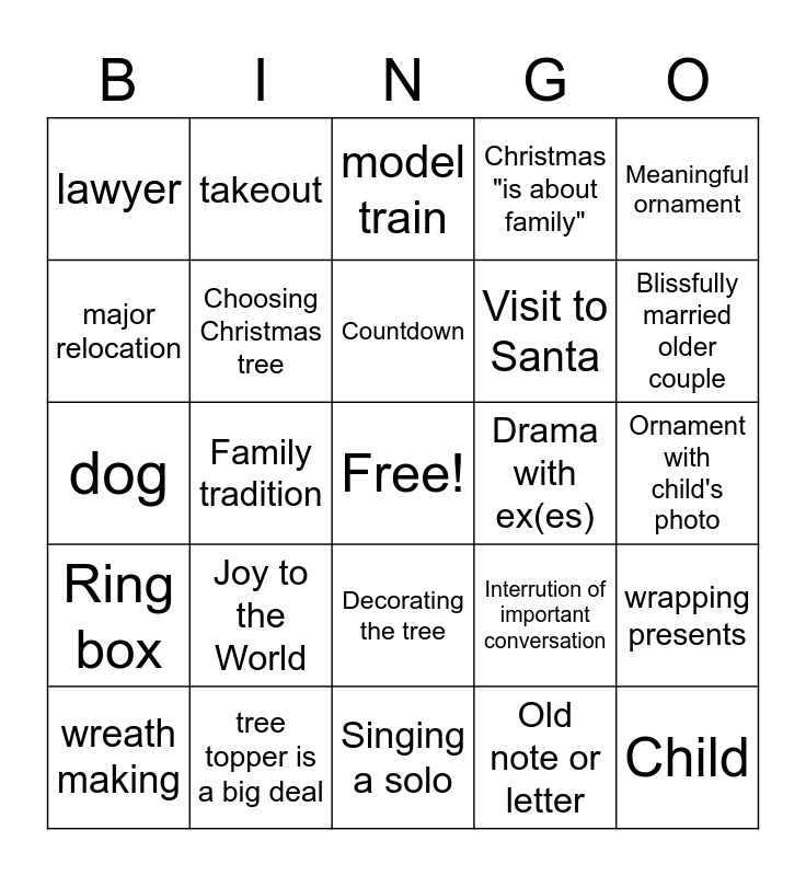This bingo card has a free space and 82 words: Hot cocoa, mistletoe, model train, Dead, big project due Christmas Eve, orphans or foster kids, "overthinking", tree lighting, Denver, NYC, Local holiday event, At least 2 interrupted kisses, Choosing Christmas tree, Drama with ex(es), misunderstanding sighting with person, lawyer, wreath making, major relocation, major career change, eggnog, Main guy dressed as Santa, Visit to Santa, Child, Meaningful ornament, Family tradition, 10 min left: Everything terrible, Main girl dressed up; main guy: "Wow", Snow as a plot point, Snow globe, We Wish You a Merry Christmas, Joy to the World, O Christmas Tree, dog, pining, "Your home is beautful", Singing a solo, Christmas pageant, Hates Christmas at start; loves it at end, Blissfully married older couple, "Help me in the kitchen", "Christmas magic", Christmas "is about family", best friend is a POC, Best friend gives main character "the look", "You need to get back out there", takeout, Christianity, Countdown, S'mores, car accident, cancer, Ornament with child's photo, tree topper is a big deal, "It's not a date", "We're just friends", ice skating, workaholic, G-bread, quaint town, Interrution of important conversation, Mom has to go to the bathroom, Toby has to go to the bathroom, Ring box, Christmas treats, Snowball fight, "It's a Wonderful Life", Guy is a chef/baker, Main characters wear same color, caroling, Christmas wedding, Building a snowman, Putting lights on house, Decorating the tree, Old note or letter, Plan to spend Christmas alone, Doctor or nurse, Family reconciliation, office Christmas party, ugly Christmas sweater, Christmas dinner, wrapping presents and decorating tree.