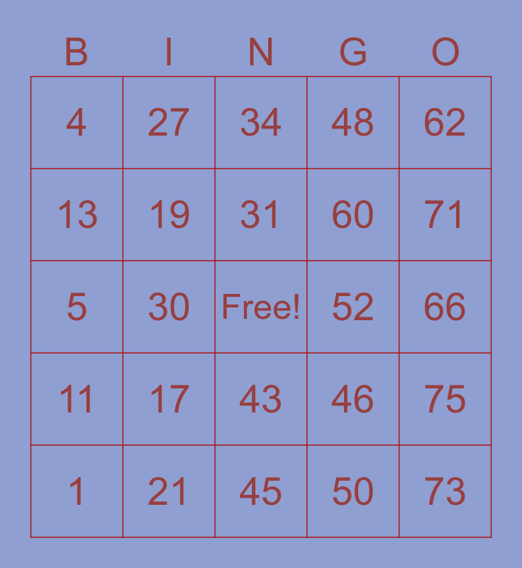 This bingo card has a free space and 24 words: 1, 17, 31, 50, 62, 4, 27, 34, 52, 66, 5, 19, 46, 75, 13, 21, 45, 48, 71, 11, 30, 43, 60 and 73.