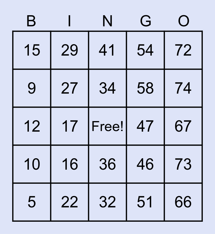 This bingo card has a free space and 24 words: 5, 16, 34, 51, 72, 15, 29, 41, 47, 67, 12, 27, 46, 73, 9, 22, 32, 54, 74, 10, 17, 36, 58 and 66.