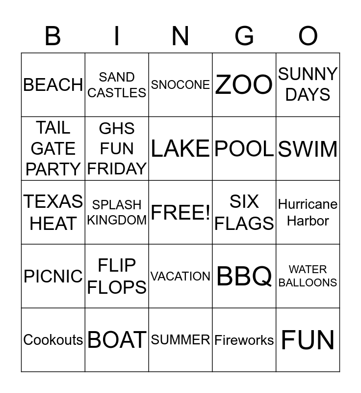 This bingo card has a free space and 24 words: FLIP FLOPS, BOAT, LAKE, Cookouts, SUNNY DAYS, BEACH, TAIL GATE PARTY, SAND CASTLES, SIX FLAGS, VACATION, POOL, TEXAS HEAT, BBQ, WATER BALLOONS, GHS FUN FRIDAY, Fireworks, Hurricane Harbor, SNOCONE, SWIM, SPLASH KINGDOM, FUN, PICNIC, ZOO and SUMMER.