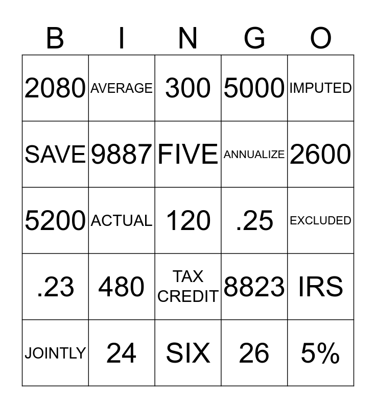 This bingo card has 25 words: 480, SIX, FIVE, JOINTLY, IMPUTED, 2080, SAVE, AVERAGE, .25, TAX CREDIT, ANNUALIZE, 5200, 8823, IRS, 9887, 5%, EXCLUDED, 300, 2600, ACTUAL, 120, 24, .23, 5000 and 26.