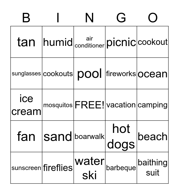 This bingo card has a free space and 24 words: sand, fireflies, pool, sunscreen, cookout, tan, sunglasses, humid, vacation, boarwalk, fireworks, ice cream, hot dogs, beach, cookouts, barbeque, camping, air conditioner, ocean, mosquitos, baithing suit, fan, picnic and water ski.