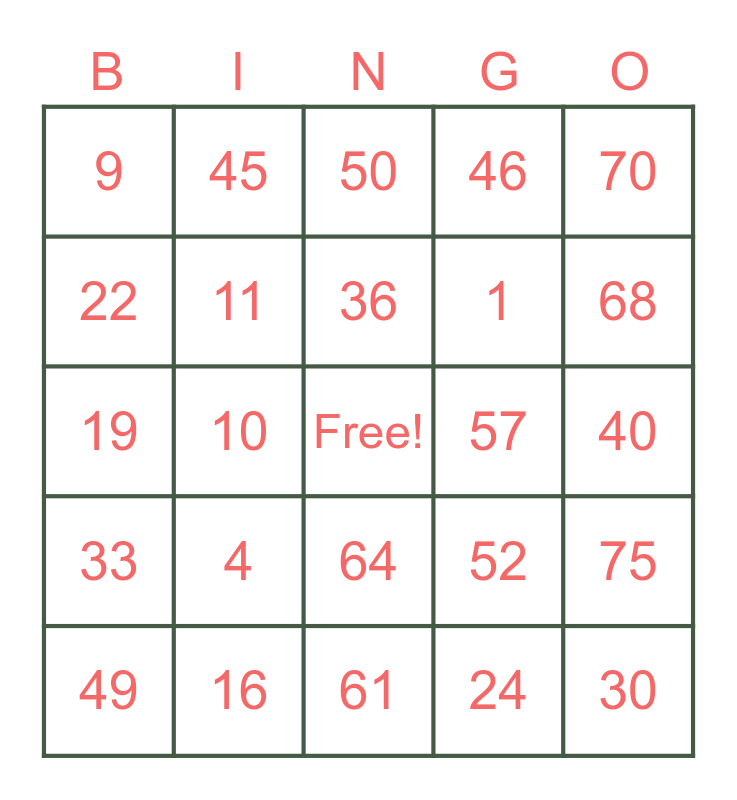 This bingo card has a free space and 24 words: 4, 16, 36, 49, 70, 9, 22, 45, 57, 64, 1, 19, 52, 75, 11, 24, 40, 50, 68, 10, 30, 33, 46 and 61.