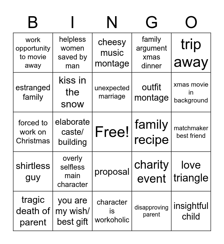This bingo card has a free space and 25 words: overly selfless main character, character is workoholic, unexpected marriage, tragic death of parent, trip away, work opportunity to movie away, estranged family, helpless women saved by man, family recipe, proposal, outfit montage, forced to work on Christmas, charity event, love triangle, kiss in the snow, kiss under mistletoe, matchmaker best friend, cheesy music montage, xmas movie in background, elaborate caste/ building, insightful child, you are my wish/ best gift, shirtless guy, family argument xmas dinner and disapproving parent.