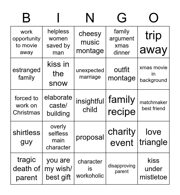 This bingo card has 25 words: overly selfless main character, character is workoholic, unexpected marriage, tragic death of parent, trip away, work opportunity to movie away, estranged family, helpless women saved by man, family recipe, proposal, outfit montage, forced to work on Christmas, charity event, love triangle, kiss in the snow, kiss under mistletoe, matchmaker best friend, cheesy music montage, xmas movie in background, elaborate caste/ building, insightful child, you are my wish/ best gift, shirtless guy, family argument xmas dinner and disapproving parent.