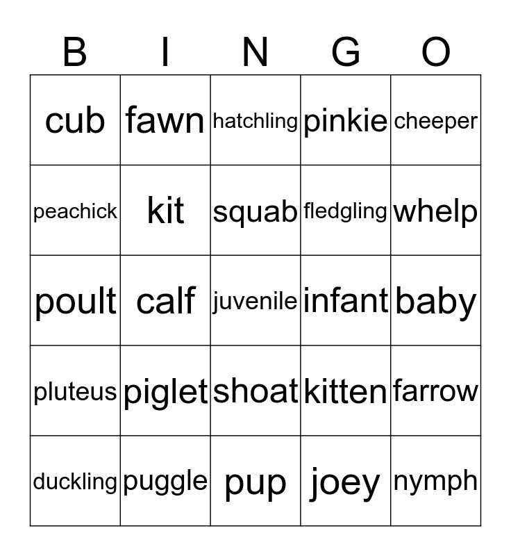 This bingo card has 31 words: pup, chick, calf, larva, cub, hatchling, kit, kitten, infant, joey, baby, juvenile, nymph, foal, whelp, colt, farrow, piglet, pluteus, shoat, cheeper, cria, duckling, fawn, fledgling, peachick, pinkie, poult, puggle, squab and tadpole.