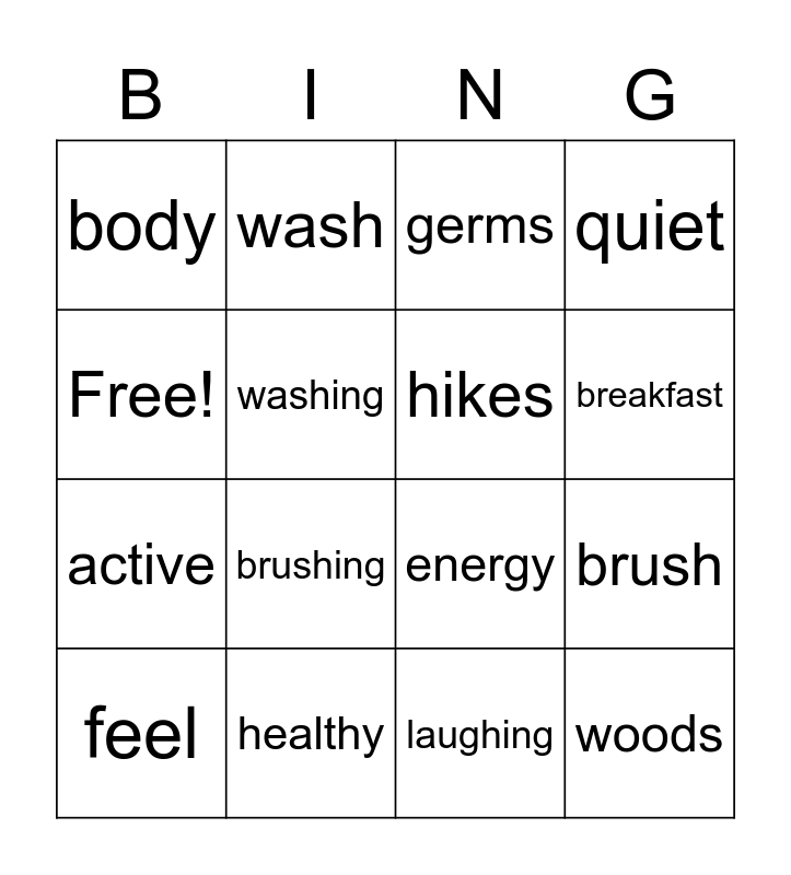 This bingo card has 16 words: healthy, brush, germs, body, active, wash, energy, laughing, Free!, washing, feel, quiet, brushing, breakfast, hikes and woods.